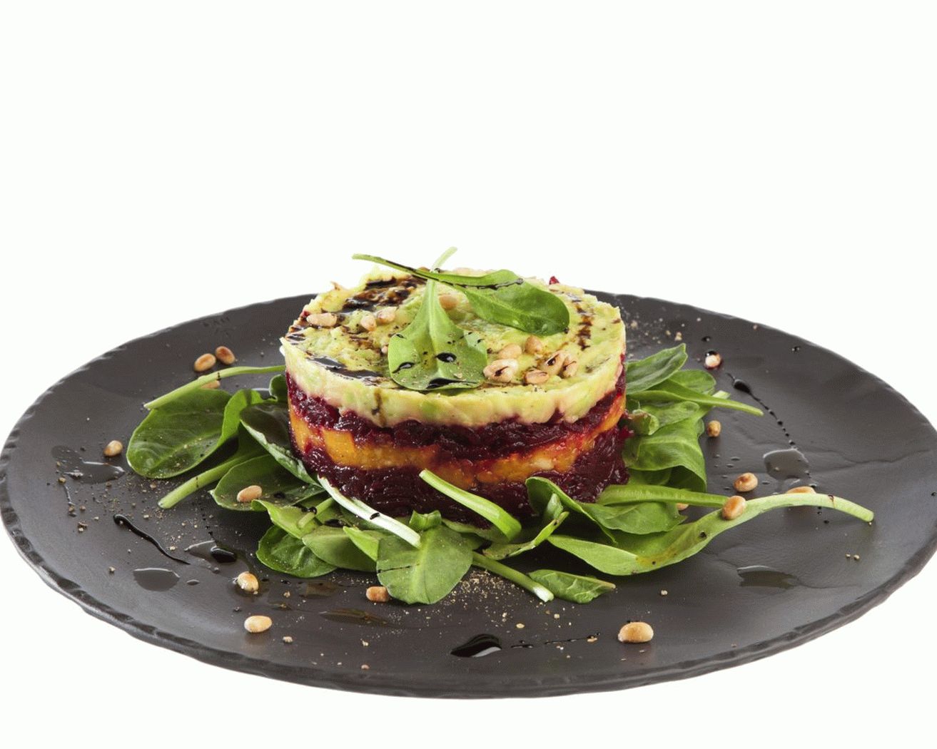 - Spinat auf einem Teller verteilen, gefolgt von Schichten von Rüben, Kürbis, Rüben, Avocados. Mit Nüssen bestreuen und mit Balsamico dekorieren Sahne.
