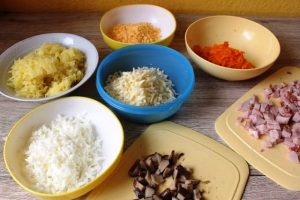 - Eingelegte Pilze und geräuchertes Hähnchen (kann eingelegt werden fein gehackte Gurken.