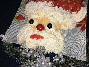 - Dann formen wir einen Hut aus Tomaten und Proteinen, aus Proteinen, die wir herstellen Weihnachtsmannbart, Augen – aus Eiweiß und Oliven, Nase – aus einer Tomate Kirsche, und der Mund ist aus einem Stück Tomate.
