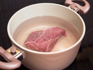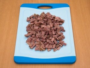 - Das Rinderfilet ins Feuer legen, aufkochen lassen, herausnehmen schäumen, noch eine halbe Stunde kochen lassen. Gekühltes Fleisch quer durch die Fasern schneiden in kleine Stücke.