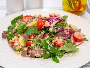 Ein köstlicher und gesunder Rindfleischsalat mit Couscous. Couscous ist Weizen Getreide, das aus Grieß hergestellt wird, dass in seiner eine Linie von Hartweizen. Der Vorteil von Couscous in der Geschwindigkeit Hausmannskost gegen Nudeln und andere Getreide, es ist genug, kochendes Wasser darüber zu gießen.