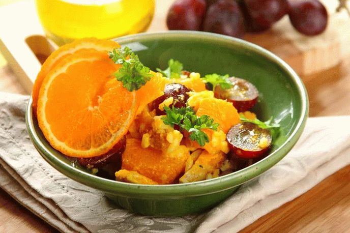 - In einer Schüssel Reis, Fleisch, Mandarinen und Trauben mischen. Orangensaft mit etwas Curry mischen und übergießen diese Salatsauce. Das Gericht in Teller legen und mit servieren zum Tisch.