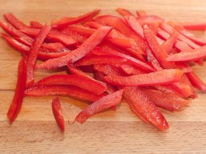 Paprika in großen Streifen mahlen.