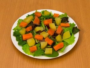 - Als nächstes Kartoffelstücke, Fisch auslegen, Salat darüber streuen tanken.