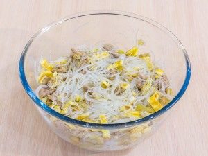 - Funchoza fünf Minuten lang mit kochendem Wasser gießen, ausspülen und zurücklehnen Sieb.