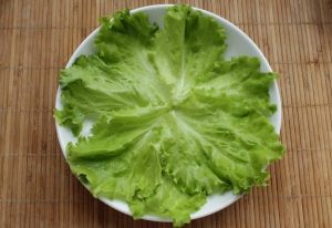 Mit Olivenöl würzen und auf einen Teller mit Blättern legen Salat.