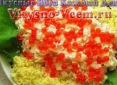 Salate mit rotem Kaviar, deren Fotos Appetit machen Am höchsten Punkt bemühen wir uns um eine Abweichung für den Urlaub. Das leckerste Triumvirat, das solche mit einschließt Salat: Roter Kaviar, Lachs, Eier. Wir schlagen vor, auch klassisches Trio brauner oder schwarzer Reis.