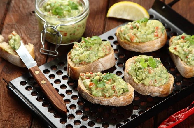 Ein Baguette oder ein dünnes Brot in Scheiben schneiden und darauf verteilen duftende Mischung aus Avocado, in eine Schüssel geben, mit Blättern dekorieren Petersilie und sofort servieren.