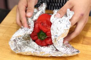 Paprika in Folie gewickelt und bei 190 in den Ofen geschickt Grad für 20 Minuten. Wir nehmen den Pfeffer in der Folie heraus, kühlen ihn ab, öffnen ihn, geschält und geschält. Wir hacken den zubereiteten Pfeffer sehr fein.