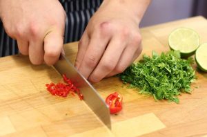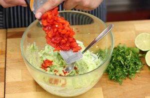 Die vorbereiteten Chilischoten in die Avocadopaste geben Gebackene Paprika, Petersilie, Zitronensaft und gut einfüllen mischen. Wir probieren die Gemüsemischung auf Salz.