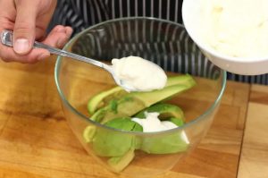 Avocado und Samen schälen, in Scheiben schneiden, abschicken Mayonnaise in eine Schüssel geben und mit einem Mixer gut mischen.