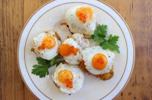 Auf einem Teller knusprige Baguettescheiben verteilen gleiche Anzahl gebratener Pfifferlinge, eine auf die andere legen Gebratenes Wachtelei, eine kleine Menge zu den Eiern geben Roter Kaviar, mit Petersilie dekorieren und servieren.