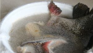 - Kochen Sie ein Set für Fischsuppe und gießen Sie 2 Liter Wasser hinein. Heb ab schäumen, salzen, ein Lorbeerblatt und Pfeffererbsen hinzufügen. Nach 35 Minuten kochen, filtern wir die Brühe. Das Fleisch von den Knochen trennen.