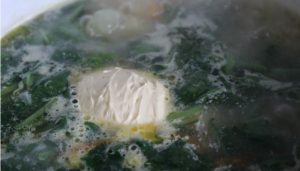 - Den Spinat in Nudeln schneiden und zur Brühe geben.