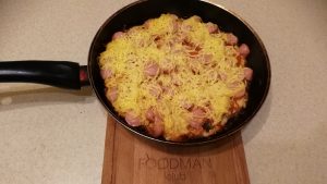 Anstelle von Rührei können Sie auch zu Hause leckere schnelle Pizza kochen Pfanne mit Mayonnaise. Sie können es schnell tun, aber Es fällt sehr befriedigend aus. Bereiten Sie den Teig aus Mehl und Eiern mit der Zugabe von Mayonnaise.