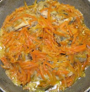 Buchweizen waschen. Das Huhn in Portionen schneiden und In einer Pfanne mit hohen Rändern zusammen mit Zwiebeln, Karotten und Zwiebeln anbraten Paprika.