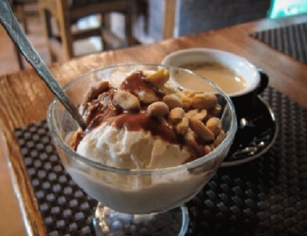 - Wir gießen eine Portion Eis mit fertigem Schokoladensirup.