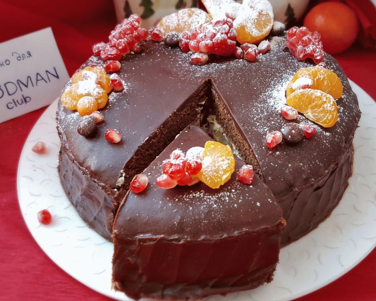 - Den Kuchen mit Schokoladenglasur bedecken und selbst dekorieren Diskretion. Ich dekorierte den Kuchen mit Mandarinenscheiben, Granatapfelkernen, драже m&ms и сахарной пудрой. Unser Kuchen ist fertig, viel Spaß Appetit!