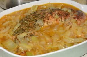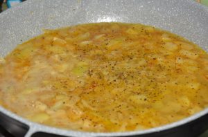 Nach dem Schneiden die gehackte Zwiebel in das Öl geben und braten bis goldene Farbe, Brühe einfüllen, Salz, Pfeffer und Zwiebel schmoren 2 Minuten.
