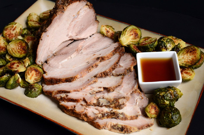 Wir nehmen das fertige duftende gekochte Schweinefleisch heraus, lassen es für 5 Minuten stehen und dienen. 20 Minuten vor dem Kochen können Sie das Formular hinzufügen Kohl Rosenkohl und backen auf einer Beilage.