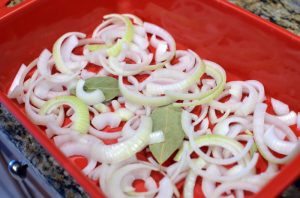 Zwiebeln in halbe Ringe schneiden, auf dem Boden verteilen hitzebeständig und Lorbeerblatt hinzufügen.