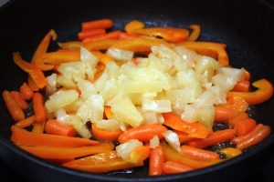 Geschälte Paprika in Streifen schneiden, Ananas in Würfel schneiden. Pfefferstrohhalme mit Minikarotten in heißem Öl verteilen (1 Esslöffel) und unter Rühren 4-5 Minuten braten. Hinzufügen Dosenananas, mischen, abdecken und vom Herd nehmen.