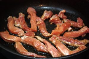 Der Schweinehals wird in dünne, lange Stücke geschnitten und darin ausgebreitet Marinade zubereiten, gut mischen und 30 Minuten ziehen lassen Minuten.