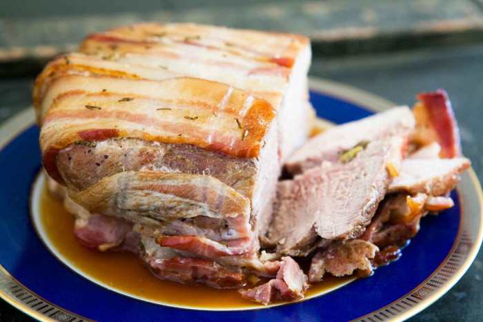 Wenn Sie köstliches gekochtes Schweinefleisch mögen, kochen Sie es zu Hause aus Schweinefleisch Schinken. Dass Fleisch wohlriechend und saftig geworden ist, ist notwendig vorbraten (die Säfte darin verschließen), wickeln Speckstreifen und backen. Beim Backen schmilzt der Speck Das Fleisch einweichen und sehr zart machen.