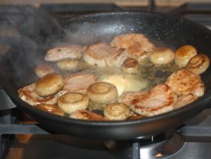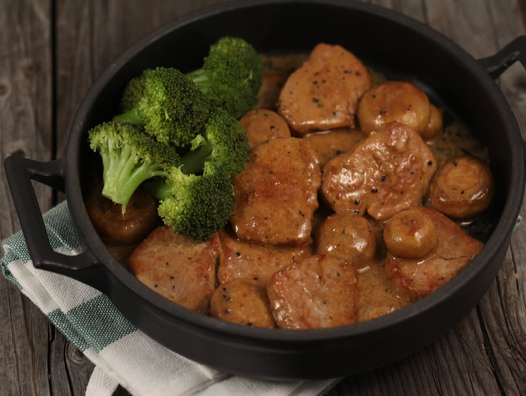 Nach dem Schneiden die gewaschenen ganzen Champignons in das Öl geben und goldbraun braten. In Champignons gebraten verteilen Lendenstückchen, Butter, gehackten Knoblauch und Butter dazugeben 2 Minuten unter Rühren braten.
