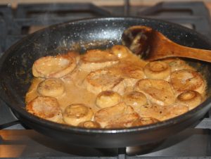 Schweinefleisch und Champignons, zu Hause in Soße unter Beigabe von Knoblauch, Sojasauce und Sauerrahm sind sehr lecker. Soja Sauce und Sauerrahm machen das Fleisch sehr zart und das Pilzgericht duftend.