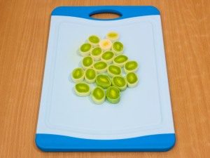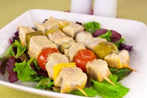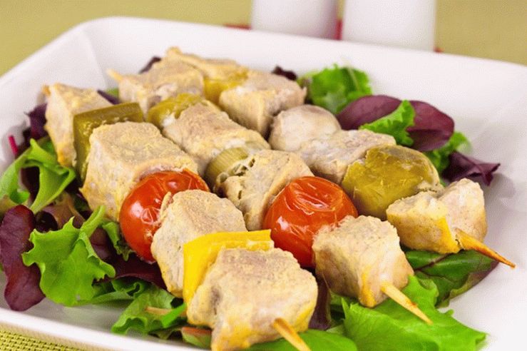 - Abwechselnd auf Holzspießen aufgereihte eingelegte Würfel Senffleisch, gekochter Kohl, Lauch (gehackt) Ringe), Pfeffer (von Samen, Trennwänden geschält und in Scheiben geschnitten) kleine Stücke) ischampinions (großer Schnitt).
