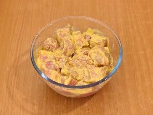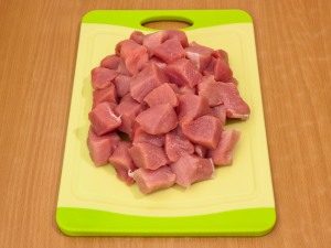 - Gewürfelte Schweinescheiben (mit zwei Seiten) cm) in einer Schüssel mit Bitterkeit vermengen, etwas Salz und Pfeffer dazugeben und für eine halbe Stunde in den Kühlschrank stellen.