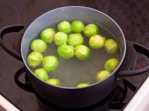 - Rosenkohl in kochendes Wasser tauchen und kochen bis Semi-Bereitschaft (sieben Minuten).
