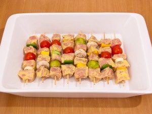 - Fertige Spieße in eine Auflaufform geben, geölt.