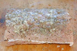 Gehackter Knoblauch gemischt mit Öl, Majoran und gemahlen Pfeffer. Ein Stück Schweinelende waschen, mit Salz einreiben und abschmecken zubereitete Knoblauchmischung. Legen Sie das Schweinefleisch in einen Behälter, schliessen und 2 Stunden abkühlen lassen.