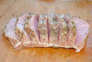 Nach 2 Stunden die Lende entfernen und 7 tiefe Schnitte machen.