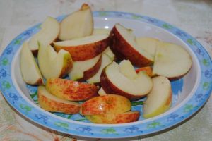 Wir befreien die Äpfel von den Samen und schneiden sie in Scheiben. Wir stellen den Ofen auf 180 Grad.