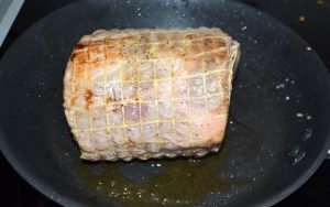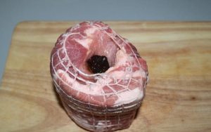 Wir waschen die Schweinelende, würzen sie im Fleischgitter oder Wir binden mit Schnur. In einem Stück in der Mitte machen wir einen Schnitt mit einem Messer und Die Pflaumen hineinlegen (3 Stk. belassen).