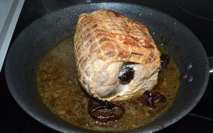 Gießen Sie die Brühe, Wein in die Pfanne, fügen Sie die Reste von Pflaumen hinzu und 40 Minuten bei 180 Grad in den Ofen stellen.