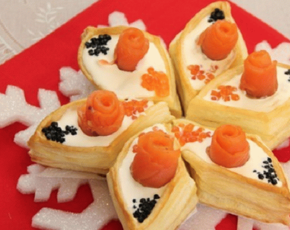Eine interessante Idee, um Fisch und Kaviar auf einem festlichen Tisch zu servieren. Es ist nicht schwierig, eine köstliche “Schneeflocke” zu Hause zuzubereiten fertiger Blätterteig. Sie können mehrere solcher Schneeflocken herstellen, aber Füllung verwenden die unterschiedlichsten für Ihren Geschmack.