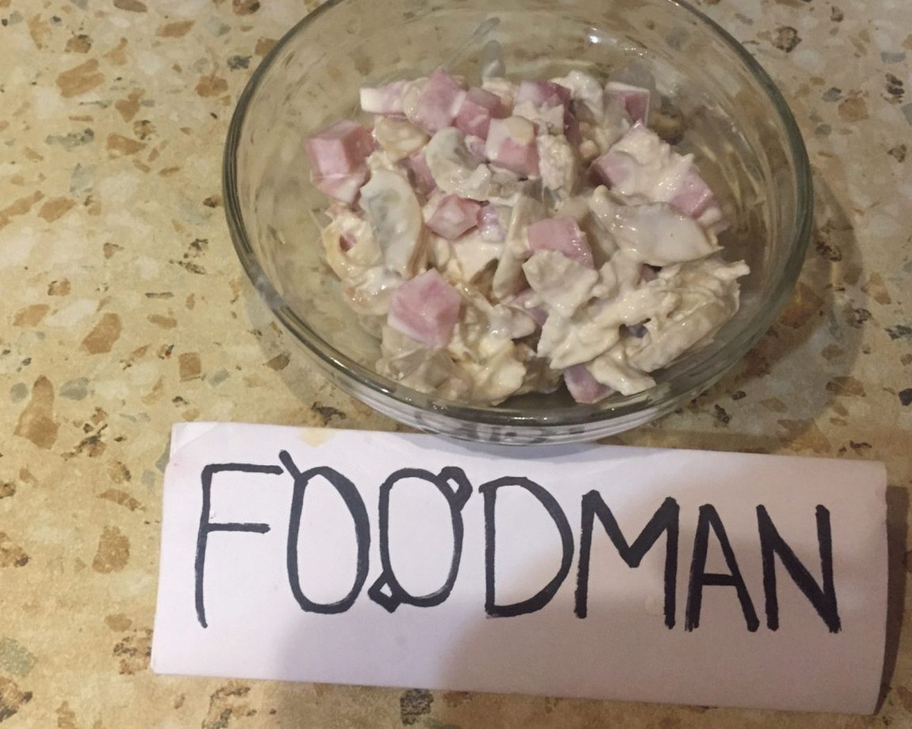 - Gehackte eingelegte Champignons und Hähnchen in eine Schüssel geben Brust und Schinken, Mayonnaise dazugeben und gut mischen. Salat bereit, guten appetit.