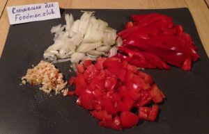 - Zwiebel und Paprika in Streifen schneiden, das Gemüse fein hacken und würfeln Knoblauch, Tomaten in Würfel schneiden.