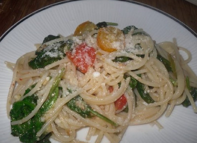 - Tomaten und Spinat mit vorbereiteten Spaghetti mischen, bestreuen geriebener Käse.