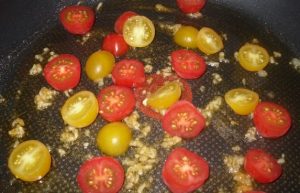 - Fügen Sie die Hälften der Kirschtomaten hinzu. Gleichzeitig kochen Spaghetti.
