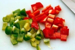 - Paprika aus der Mitte und den Kernen schälen und fein hacken in kleinen Würfeln. Gehackte Paprika in die Kartoffel geben.