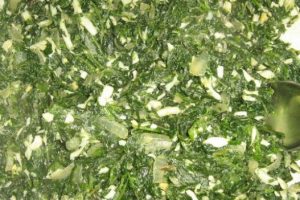 - In einer Pfanne die Butter schmelzen und den Spinat verteilen. Fügen Sie die Hälfte der Zwiebel hinzu, gehackte grüne Zwiebel. Salz hinzufügen und Pfeffer.