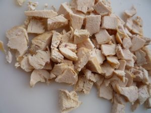 - Das Hähnchen vorher in Salzwasser kochen, abkühlen lassen direkt in der Brühe filetieren. In kleine Würfel schneiden.