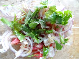 - Wir hacken die Tomaten. Wir hacken den Koriander und fügen den Tomaten Zwiebeln hinzu. Zum Abschmecken Gewürze und Salz hinzufügen. Mit Olivenöl abschmecken.