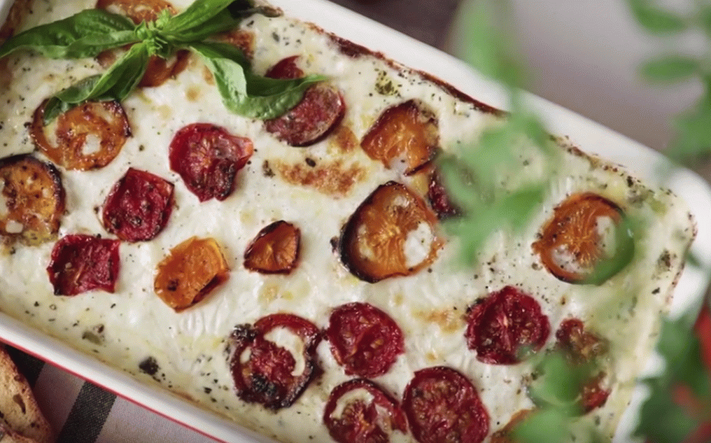 - Nachdem die Masse leicht ergriffen ist, verteilen zerbröckelter Burrato-Käse und Tomaten. Und schick backe noch einen 10 Minuten.