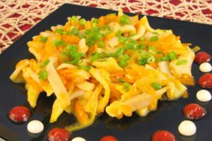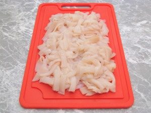 - Tintenfisch, leicht aufgetaut, schälen, waschen, schneiden Strohhalme.